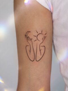 This tattoo features a single abstract curve placed delicately on the upper arm. The simplicity of the design draws attention to the line’s elegance and intentional movement. It feels modern, intimate, and quietly powerful.