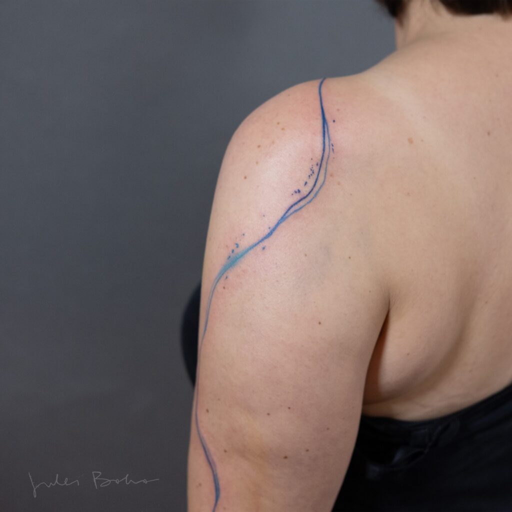 This abstract line tattoo uses soft blue ink to create a flowing, water-like design along the shoulder and upper arm. The subtle color adds depth and emotion while maintaining a minimalist aesthetic. Small ink splashes enhance its artistic feel.