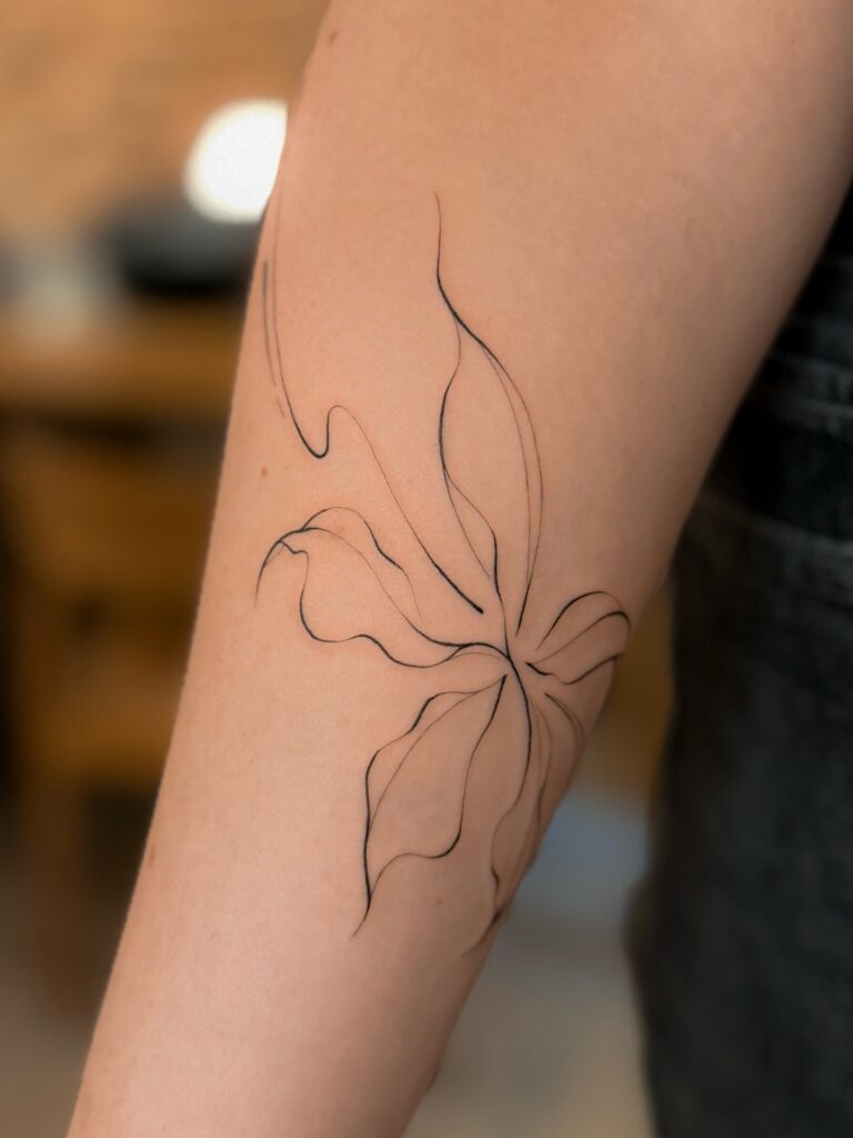 Often interpreted as a symbol of transformation and emotional expression, this tattoo blends nature with abstraction. It’s ideal for those who appreciate art-inspired tattoos that don’t follow literal forms. The fine line style ensures softness and longevity, making it a beautiful statement without overwhelming the skin.
