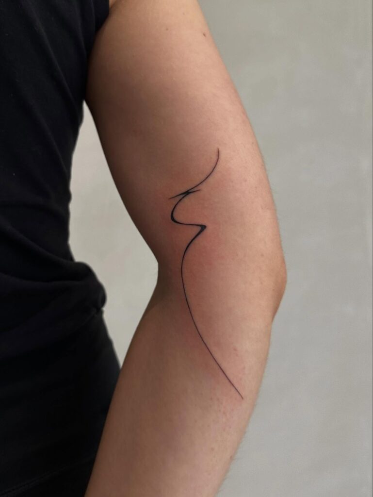 This abstract line tattoo features a single, flowing stroke placed along the natural curve of the upper arm. The thin black line bends softly, creating an organic rhythm that feels effortless and modern. Its simplicity allows the design to enhance the body’s shape rather than dominate it.