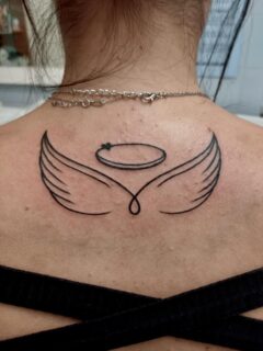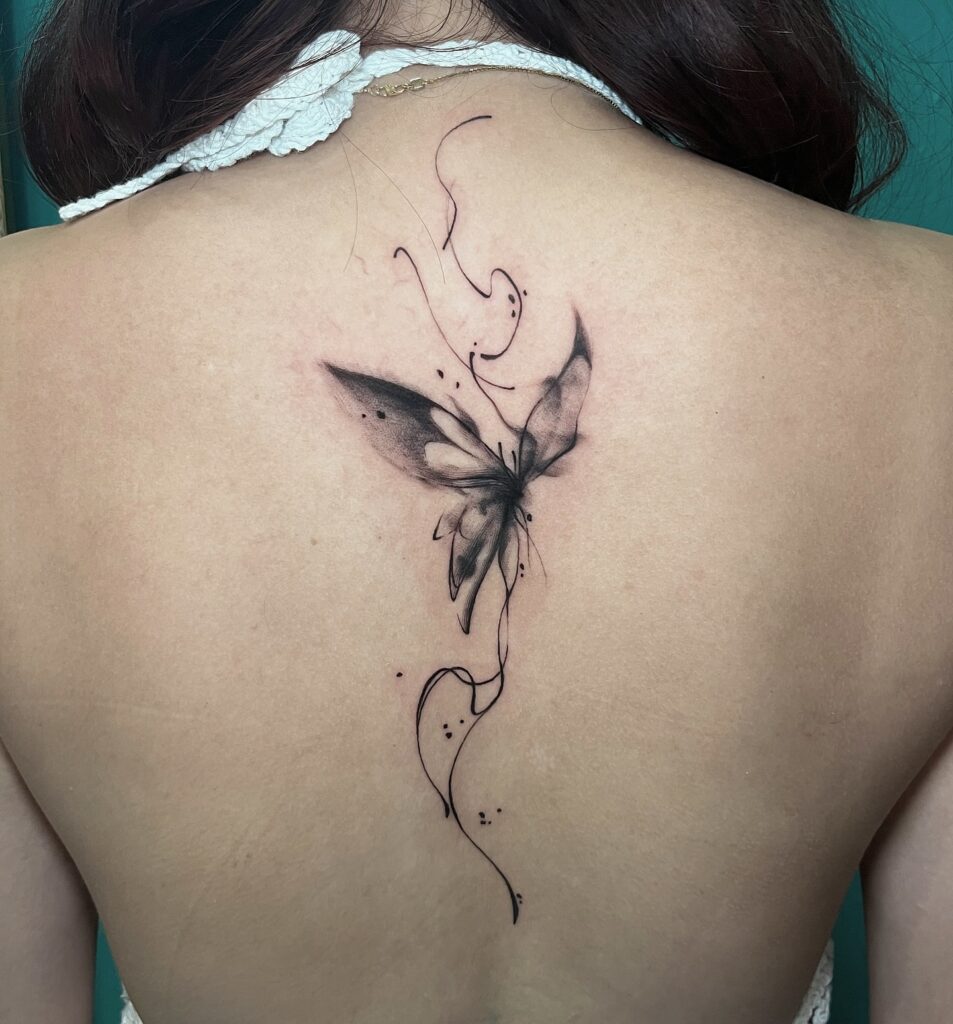 This back tattoo showcases a stylized moth or butterfly with soft shading and flowing line accents that extend outward like energy trails. The symmetrical wings contrast beautifully with the loose, abstract lines, creating a harmonious blend of structure and freedom. Its placement along the spine emphasizes elegance and balance.