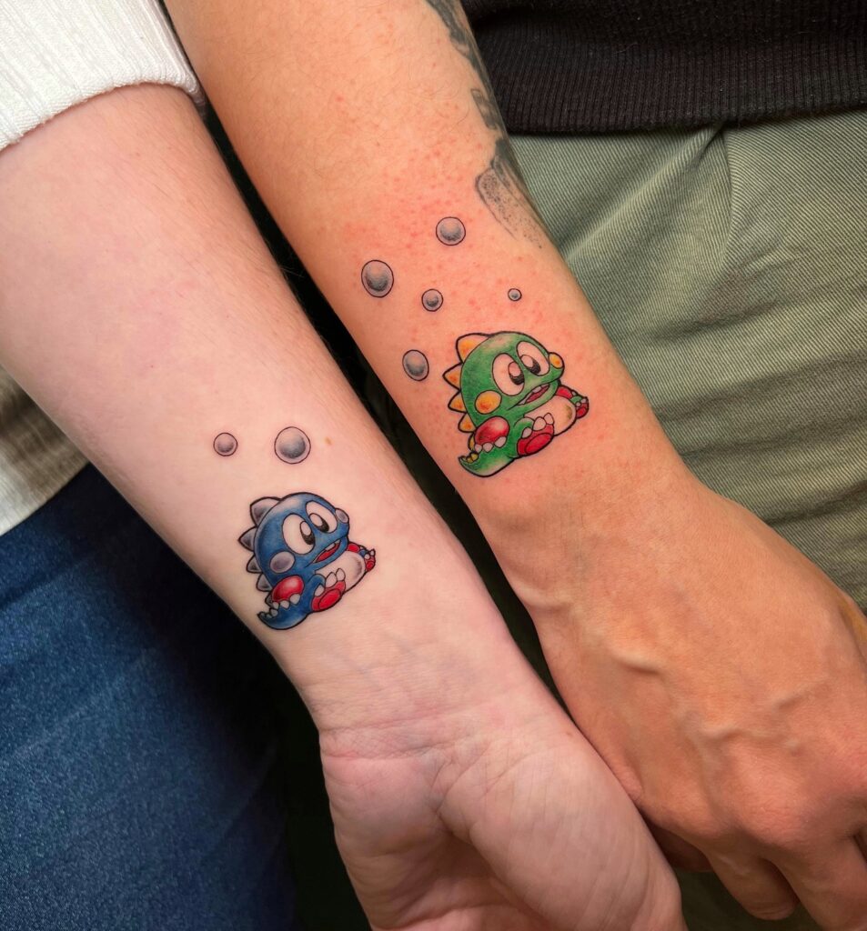 Matching tattoos like these symbolize connection, companionship, and shared memories. The cartoon style keeps the design fun rather than serious, making it perfect for couples, siblings, or close friends. This tattoo celebrates joy and togetherness while maintaining a colorful, aesthetic appeal.