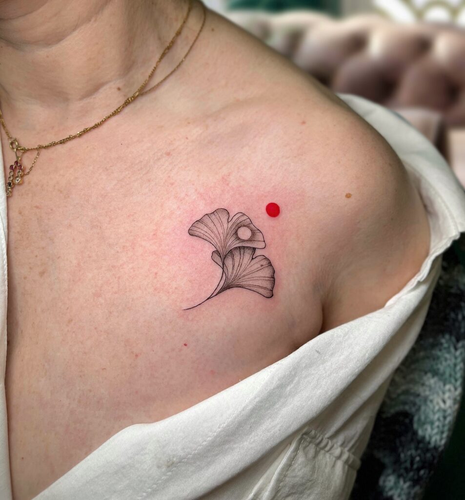 This small ginkgo leaf tattoo is placed delicately on the upper chest, using fine lines and gentle shading for a refined look. The simple composition allows the natural shape of the leaf to stand out, creating an understated yet elegant design that feels timeless.
