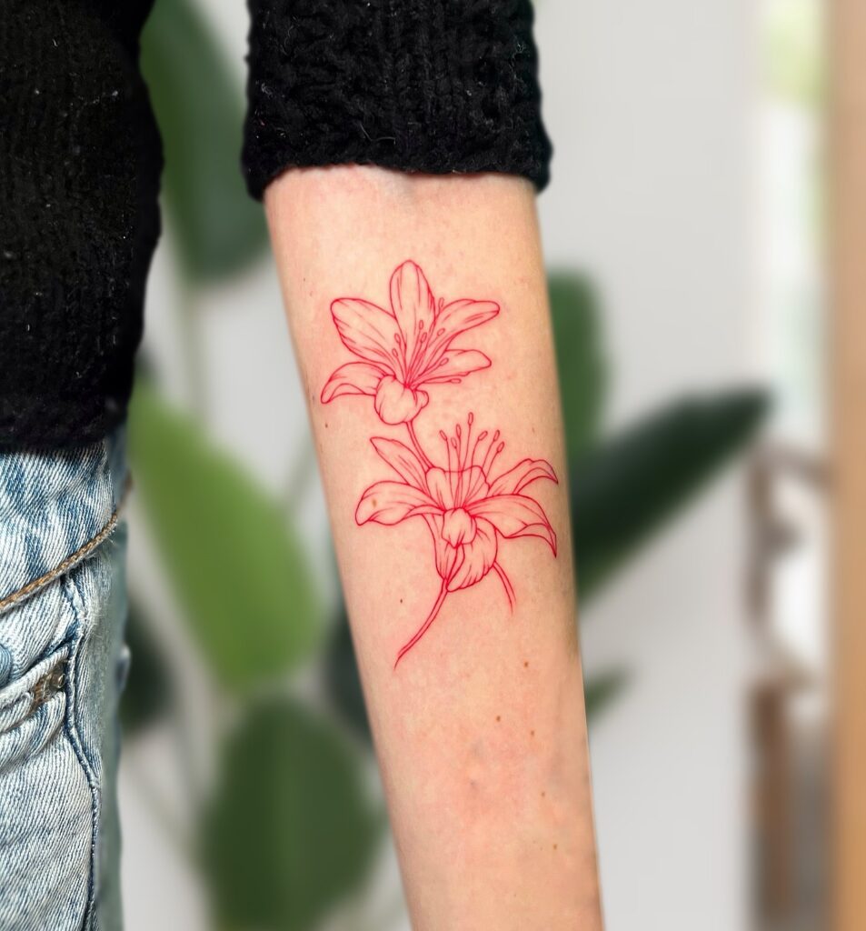 This floral tattoo is created entirely with red linework, giving it a bold yet delicate appearance. The fine outlines of the flowers feel soft and organic, while the monochromatic color choice keeps the design modern and eye-catching. Its vertical placement elongates the forearm beautifully.