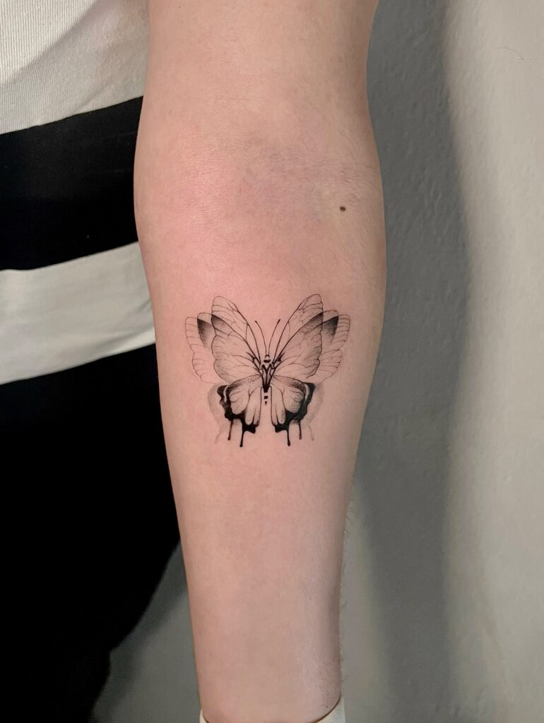 This butterfly tattoo combines delicate linework with subtle shading, creating an ethereal and almost translucent appearance. The ink drip detail at the bottom adds a contemporary twist, giving the impression that the butterfly is dissolving or transforming. Positioned on the inner forearm, it feels intimate and visually striking.