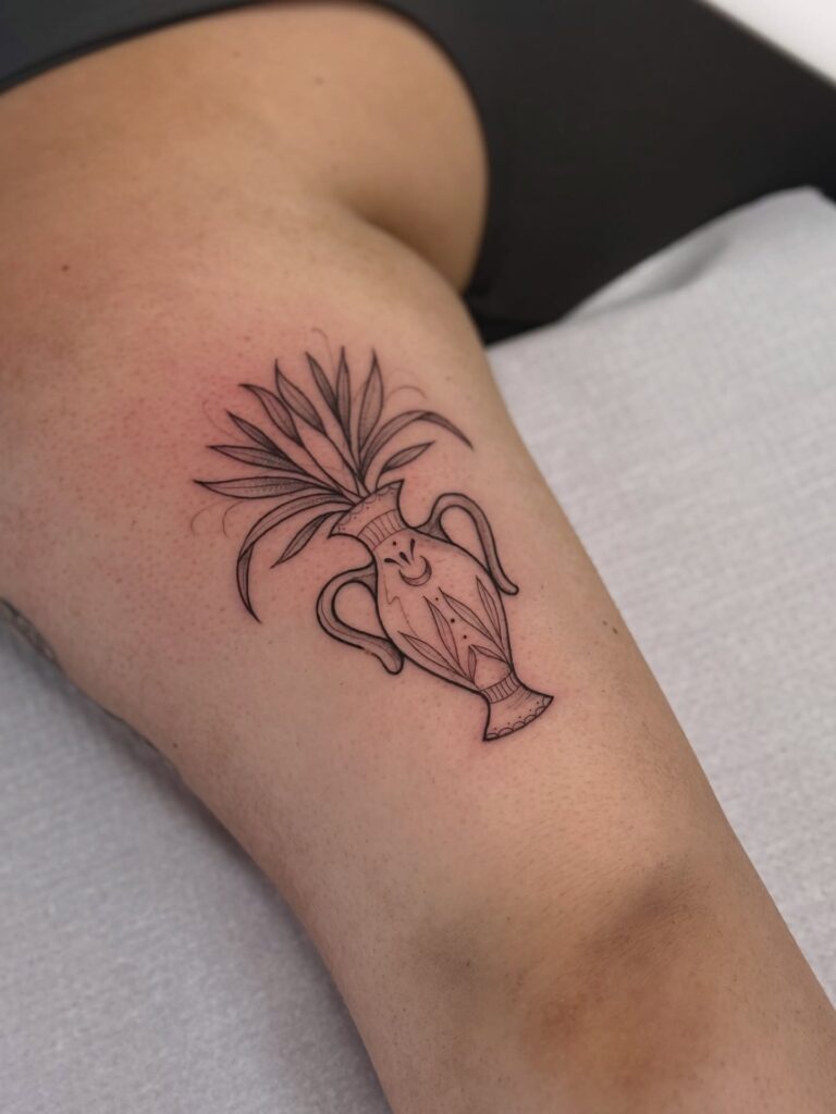 This tattoo features a minimalist amphora-style vase rendered in clean fine lines, paired with flowing botanical elements that spill upward with graceful movement. The composition feels balanced and airy, using negative space to keep the design light and elegant. Its placement on the thigh allows the curves of the vase and leaves to complement the natural shape of the body beautifully.