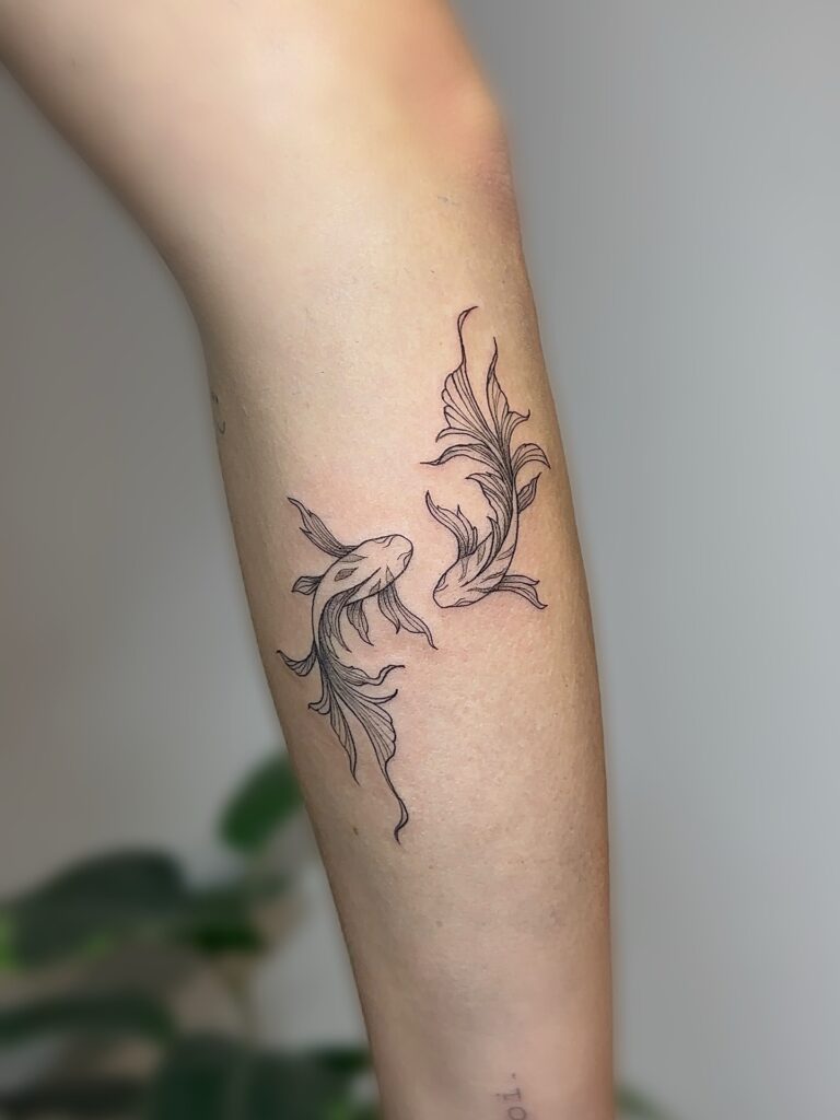 This tattoo depicts two koi fish swimming in opposite directions, forming a balanced, yin-yang-inspired composition. The fine line style keeps the design light, while the flowing fins add graceful movement. Positioned on the arm, it feels harmonious and visually soothing.