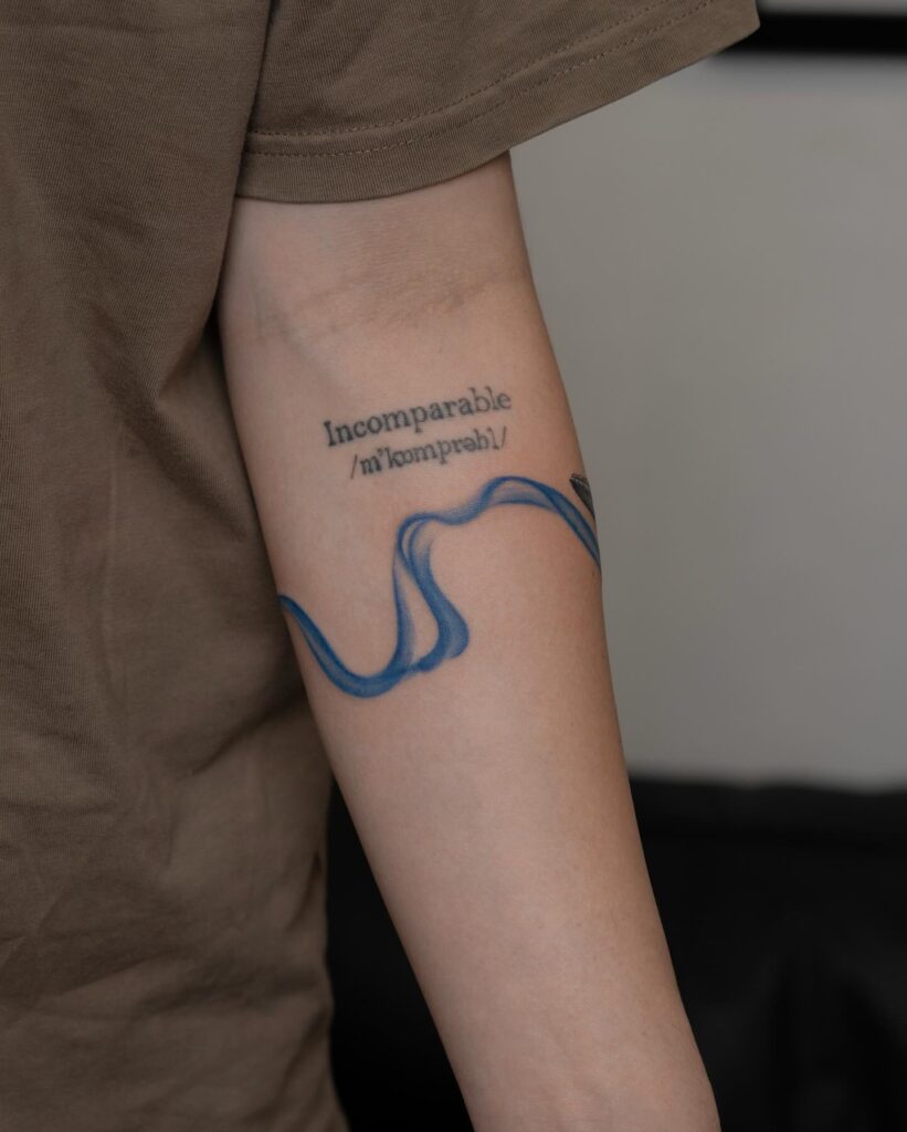 This tattoo pairs a clean typographic word with its phonetic spelling, creating a dictionary-style aesthetic. Below it, a flowing blue abstract line adds movement and contrast, softening the structured text. The combination of typography and abstract art feels modern and thoughtful.