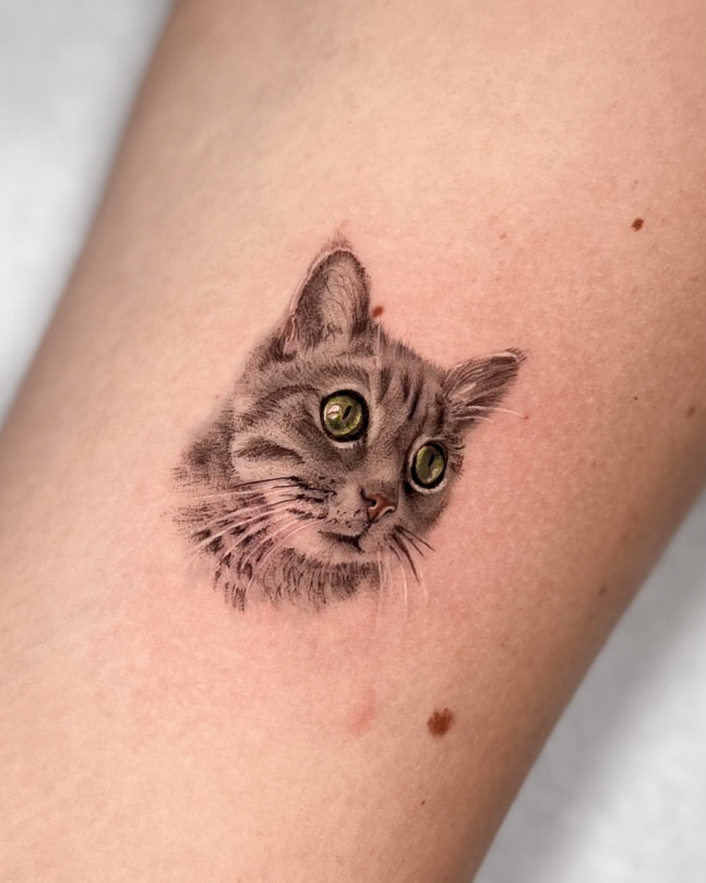 This micro-realistic cat tattoo captures intricate details, from the soft fur texture to the expressive green eyes. Despite its small size, the realism gives the design emotional depth, making it feel lifelike and intimate. Its placement on the arm keeps it visible yet personal.