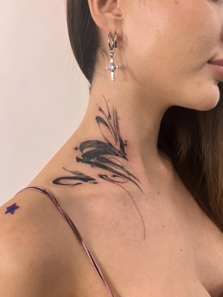 This abstract neck tattoo mimics expressive brushstrokes, creating a fluid, painterly effect that feels spontaneous yet intentional. The soft shading and irregular edges give the design movement, making it appear as though ink is flowing naturally across the skin. Its placement along the neck and shoulder enhances its bold yet refined presence.