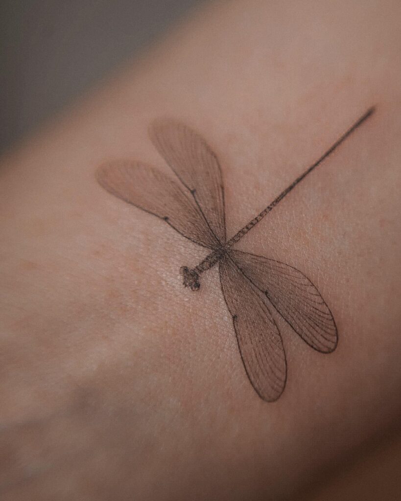 This dragonfly tattoo is executed in ultra-fine lines, capturing the insect’s fragile wings and elongated body with remarkable detail. Symbolizing transformation and adaptability, the design feels light, calm, and deeply symbolic.