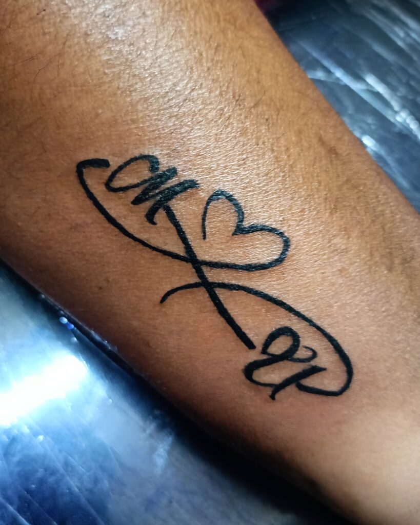This simple black-ink tattoo merges cursive lettering with a heart-shaped flourish, forming a fluid and emotional design. The clean lines and smooth curves give it a modern yet timeless look, making it visually appealing while remaining subtle.