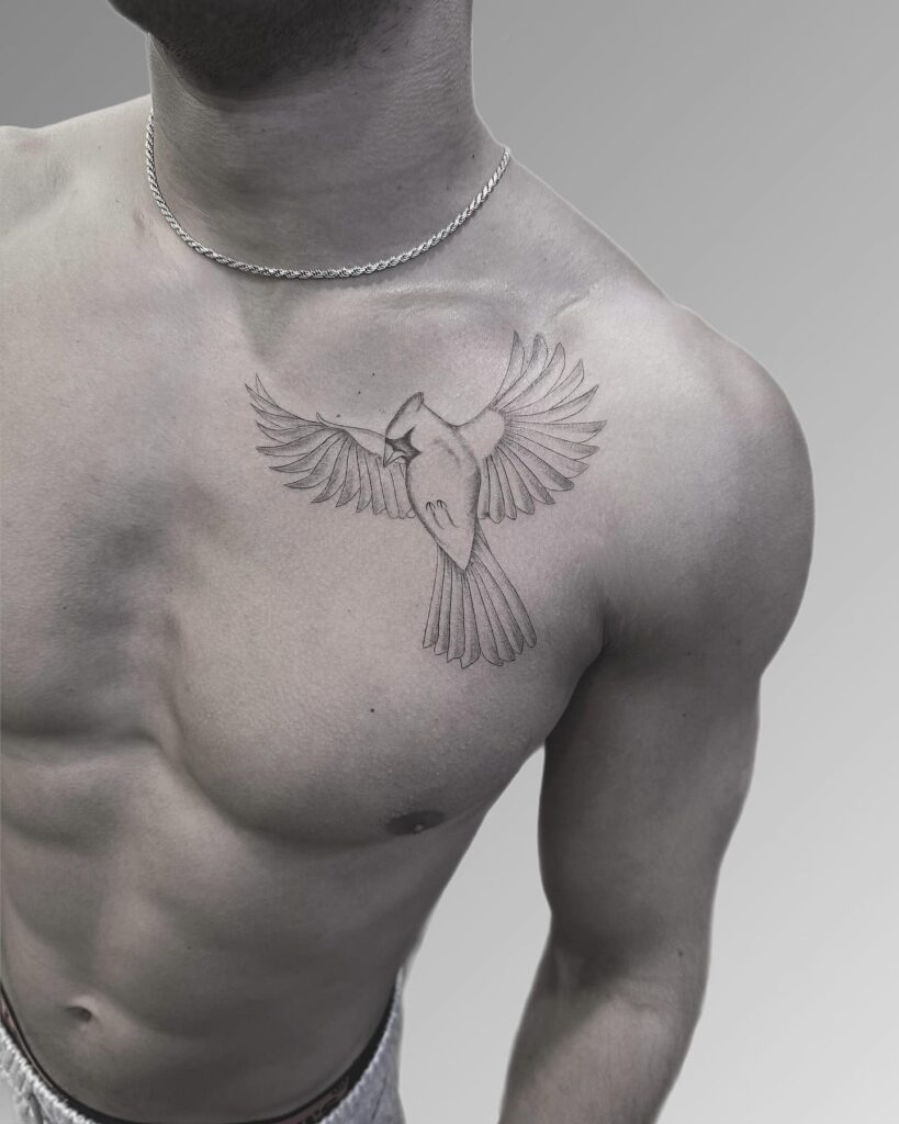 This fine-line dove tattoo spreads gracefully across the upper chest, symbolizing peace, freedom, and spiritual clarity. The delicate shading and soft outlines give it a lightweight, almost floating effect, enhancing its refined and timeless appeal. Its symmetry complements the natural contours of the chest beautifully.