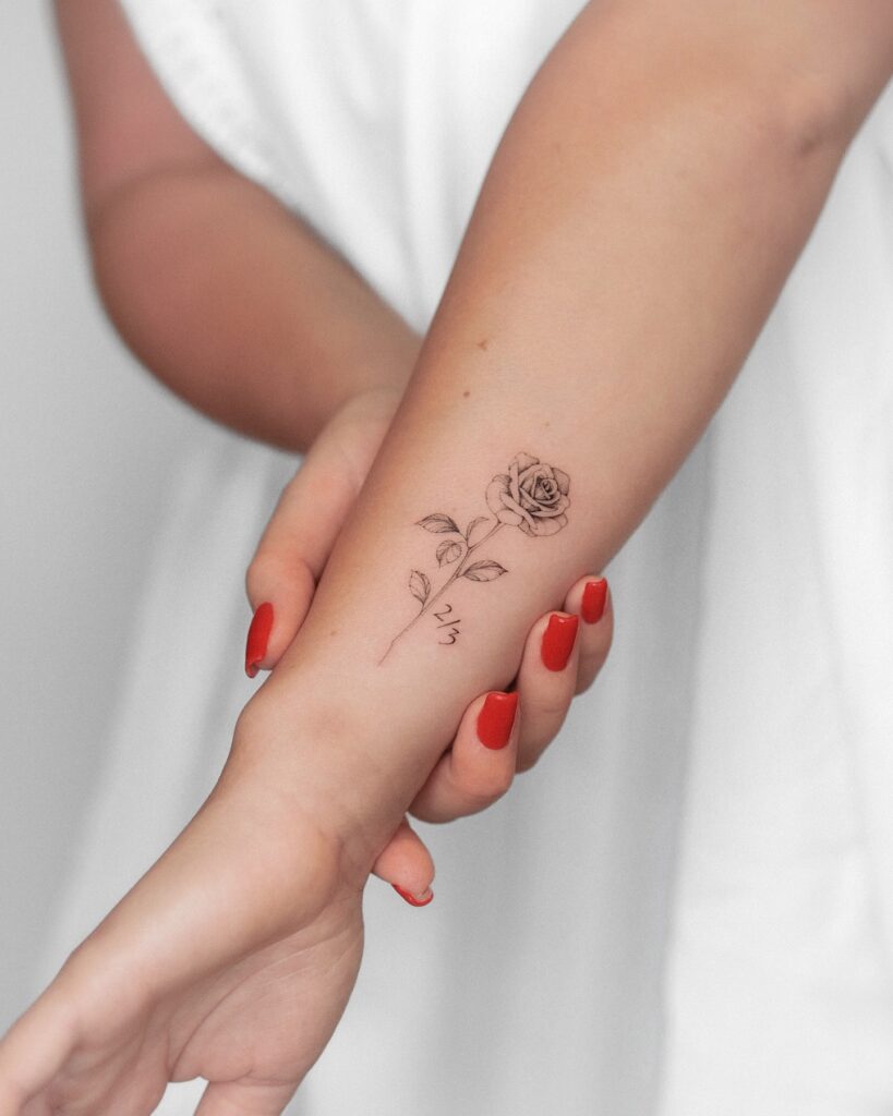 This fine-line rose tattoo is elegant and timeless, symbolizing love, beauty, and strength. The slender stem and softly detailed petals give it a gentle, refined presence, enhanced by the small handwritten detail beneath.
