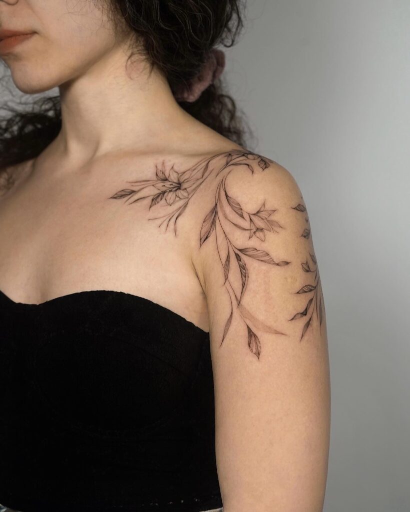 This shoulder tattoo showcases flowing leaves drawn in delicate fine lines, following the natural curve of the shoulder and collarbone. The design feels organic and airy, enhancing femininity while maintaining a sophisticated, minimalist aesthetic.