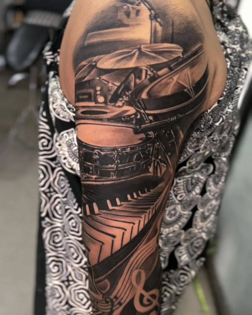 This highly detailed black-and-grey tattoo features a drum set flowing into musical elements, celebrating rhythm, passion, and creativity. The realism and smooth shading demonstrate advanced artistry while maintaining a cohesive, polished look.