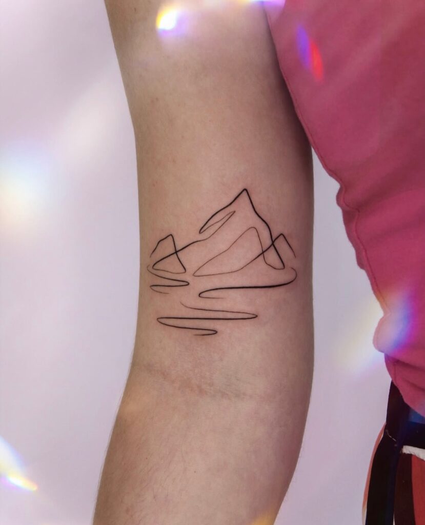 This abstract continuous line tattoo depicts a serene mountain landscape using fluid, unbroken strokes. The minimalist approach transforms natural scenery into a modern artistic expression, with gentle curves suggesting peaks, reflections, and calm water below. The simplicity allows the design to feel airy and sophisticated.