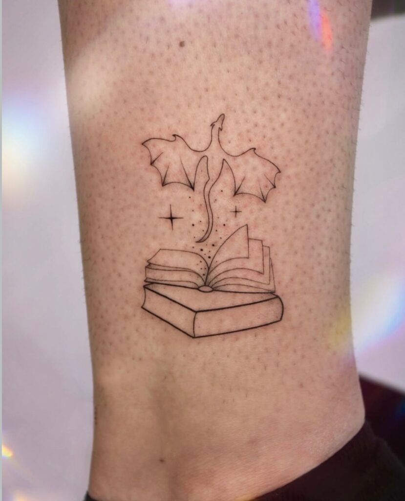 This delicate continuous line tattoo combines a flying dragon emerging from an open book, blending fantasy and knowledge into a single cohesive design. The fine line work keeps the imagery light and elegant, while small star details add a touch of magic and wonder. The composition feels balanced and thoughtfully spaced.