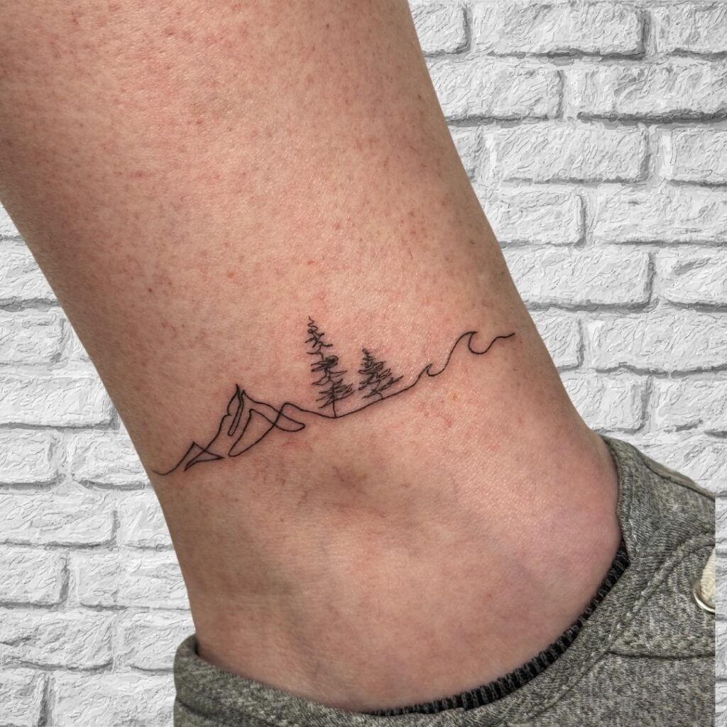 This continuous line ankle tattoo illustrates mountains, pine trees, and flowing terrain in one seamless stroke. The fine line work creates a peaceful landscape that wraps naturally around the ankle, enhancing its delicate placement. The design feels grounded and harmonious.