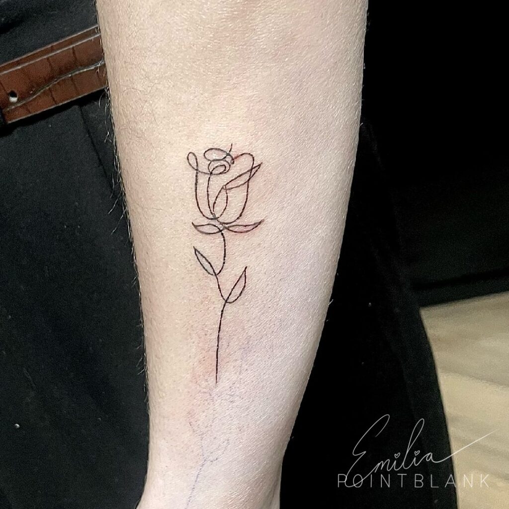 This continuous line rose tattoo captures the essence of a blooming flower with soft, looping strokes. The design feels delicate and romantic, using minimal lines to suggest petals, leaves, and stem without heavy detail. Its simplicity enhances its elegance.