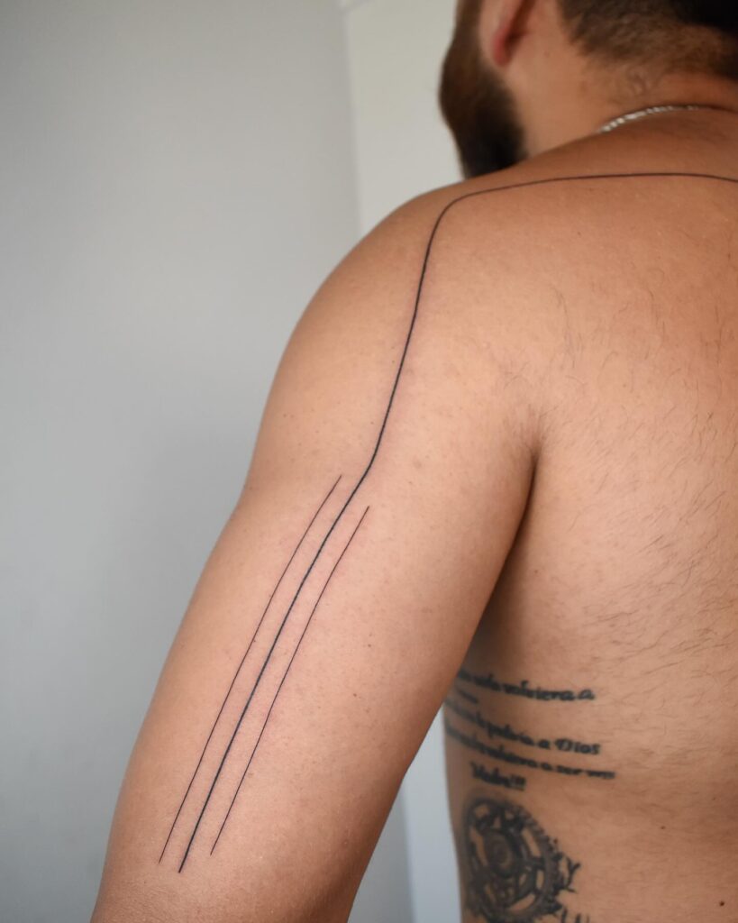 This minimalist continuous line tattoo flows elegantly along the upper arm, using a single uninterrupted stroke to create a modern, abstract statement. The thin black line follows the natural contours of the shoulder and arm, emphasizing movement, balance, and simplicity. Its clean execution makes it visually striking without being overpowering, ideal for lovers of subtle body art.