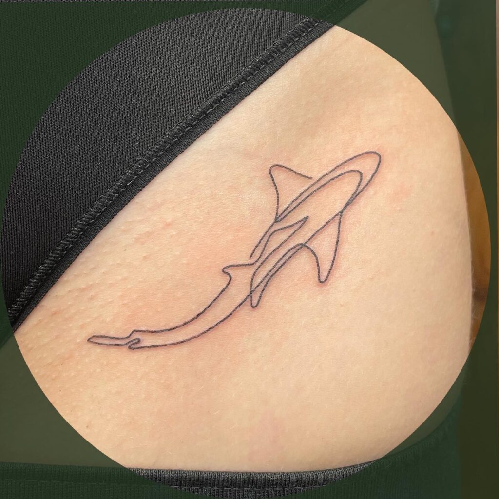 This playful continuous line tattoo forms the silhouette of a dolphin using smooth, flowing strokes. The minimalist style captures motion and grace without excessive detail, giving the design a modern, artistic feel. The single-line approach keeps it light and visually engaging.