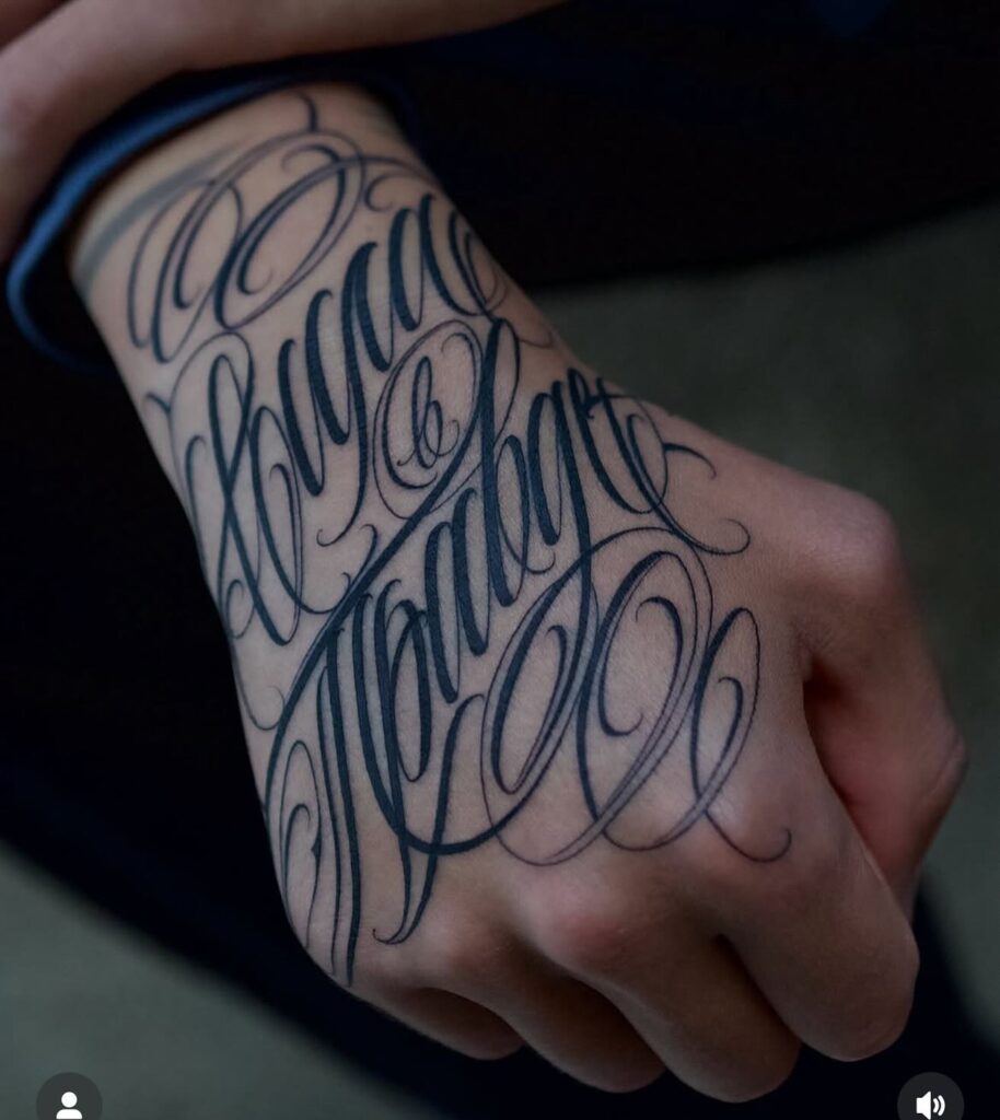 Ornate hand tattoos appeal to those who appreciate traditional calligraphy with a modern edge. The design feels expressive and artistic, turning handwriting into a powerful visual element that commands attention.