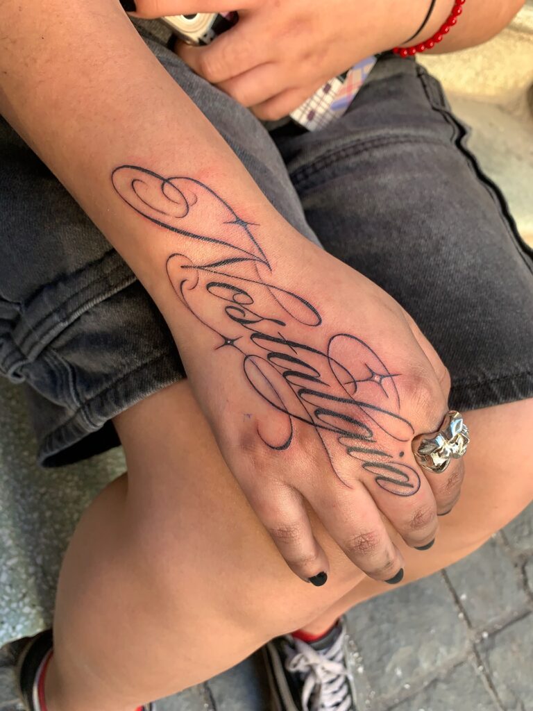 This bold cursive tattoo flows seamlessly from the wrist across the hand, using exaggerated loops and elegant swashes to create strong visual movement. The lettering feels fluid and confident, with subtle spark-like accents that add personality without overcrowding the design. Its placement turns the hand into a statement canvas.