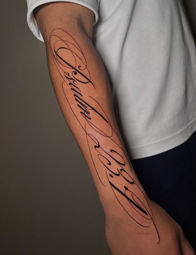 This forearm tattoo showcases oversized cursive lettering with extended flourishes that stretch across the arm. The contrast between thick and thin lines adds depth and motion, giving the design a bold yet artistic presence.