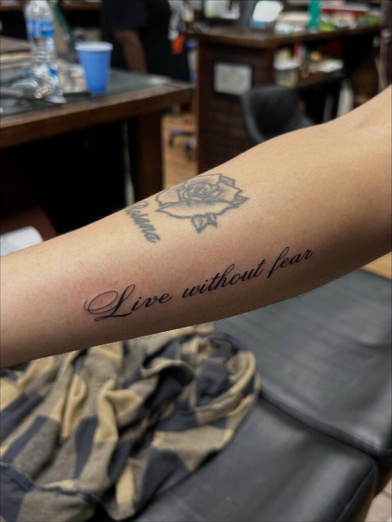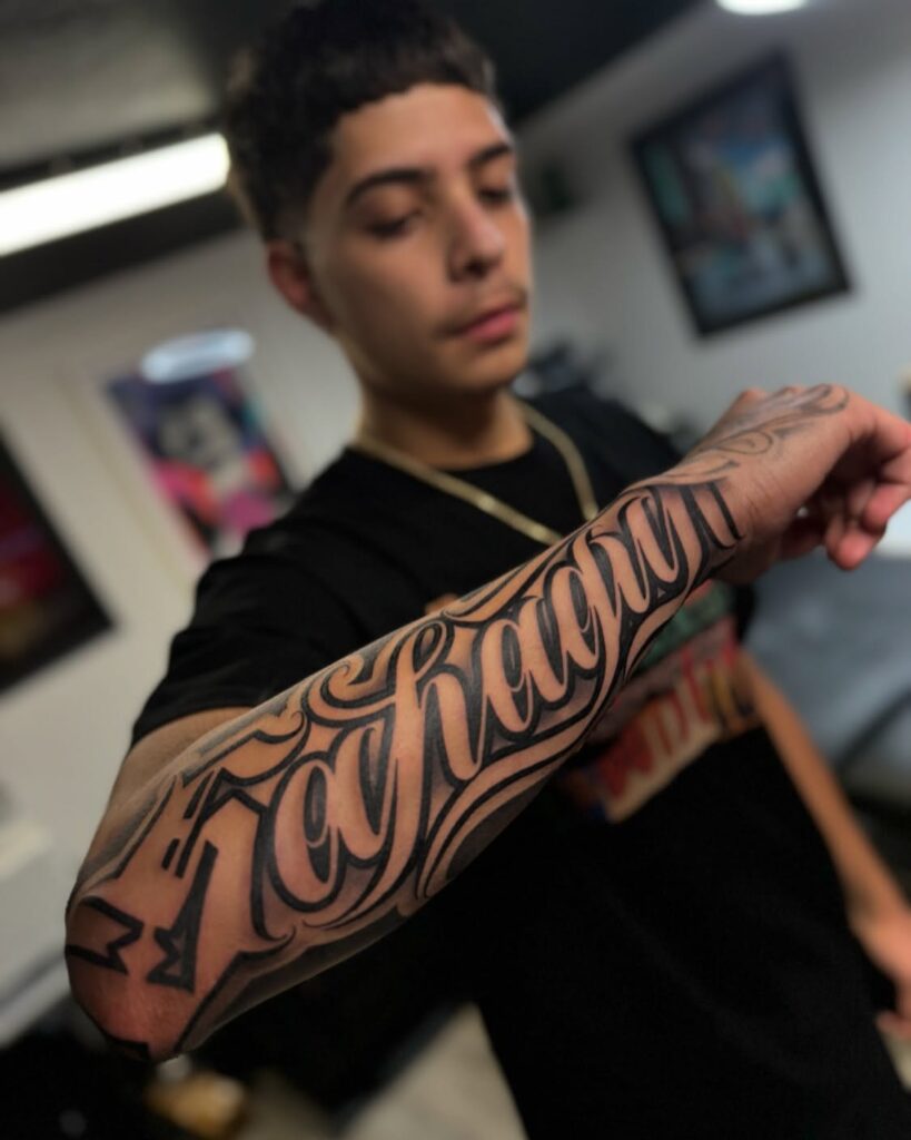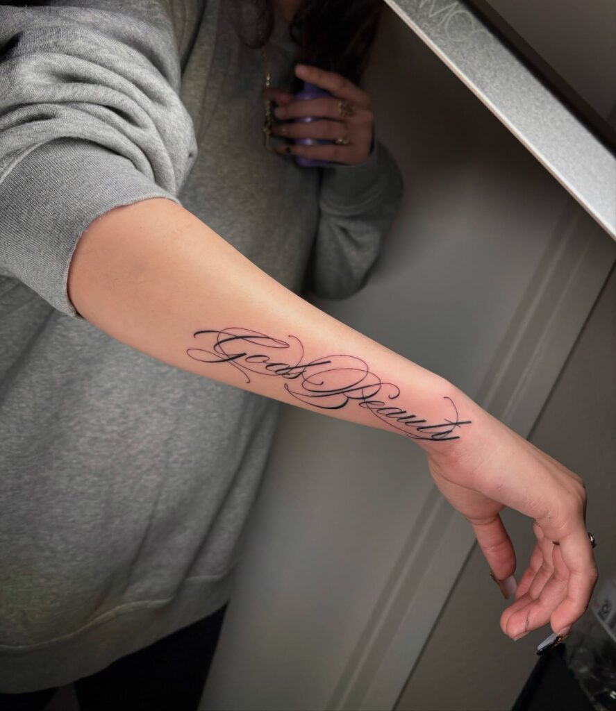 Large script tattoos like this emphasize confidence and storytelling. Perfect for names or meaningful words, the flowing calligraphy transforms the forearm into a visual statement that blends elegance with expressive strength.