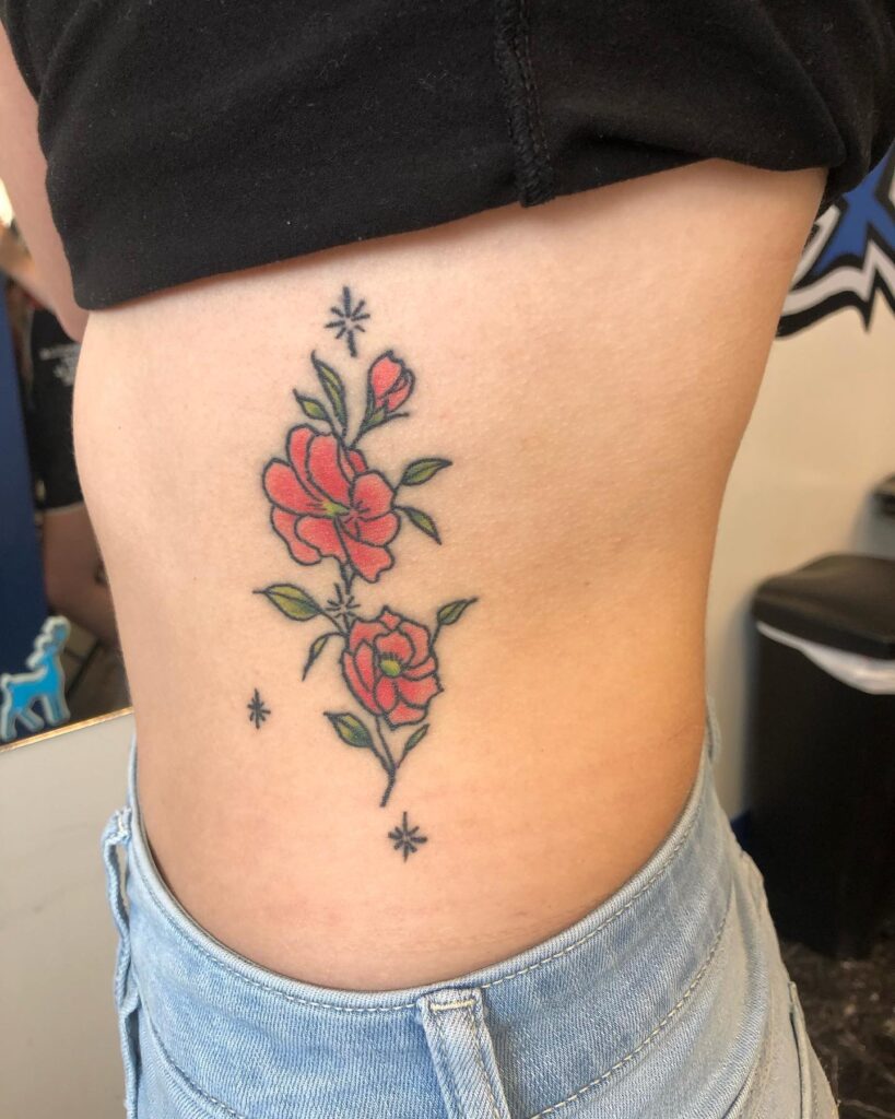 The rib placement enhances the intimate nature of this tattoo, making it both personal and visually striking. It’s ideal for those who love floral tattoos with meaning, representing love, growth, and resilience while maintaining a refined, understated aesthetic perfect for minimalist tattoo lovers.