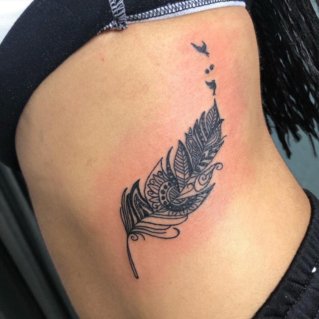 This delicate rib tattoo depicts a finely detailed feather rendered in elegant black linework. Intricate patterns within the feather add texture and depth, while the soft curvature aligns beautifully with the ribcage. Small birds above the feather enhance the theme of freedom and lightness.