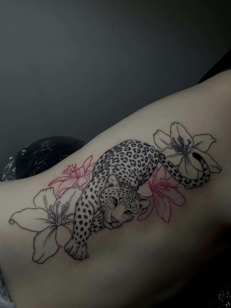 This striking rib tattoo features a lounging leopard intertwined with large floral outlines, blending strength with softness. The leopard’s detailed spots contrast beautifully with the delicate line-art flowers, creating a harmonious balance between power and femininity. Subtle red accents in the florals add depth without overpowering the design.