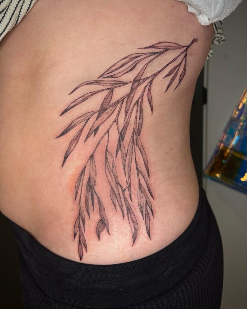 This rib tattoo features a delicate botanical branch with elongated leaves flowing downward in fine black linework. The minimalist approach emphasizes natural movement, making the design feel light and organic. Its vertical orientation complements the ribcage, enhancing the body’s natural curves.