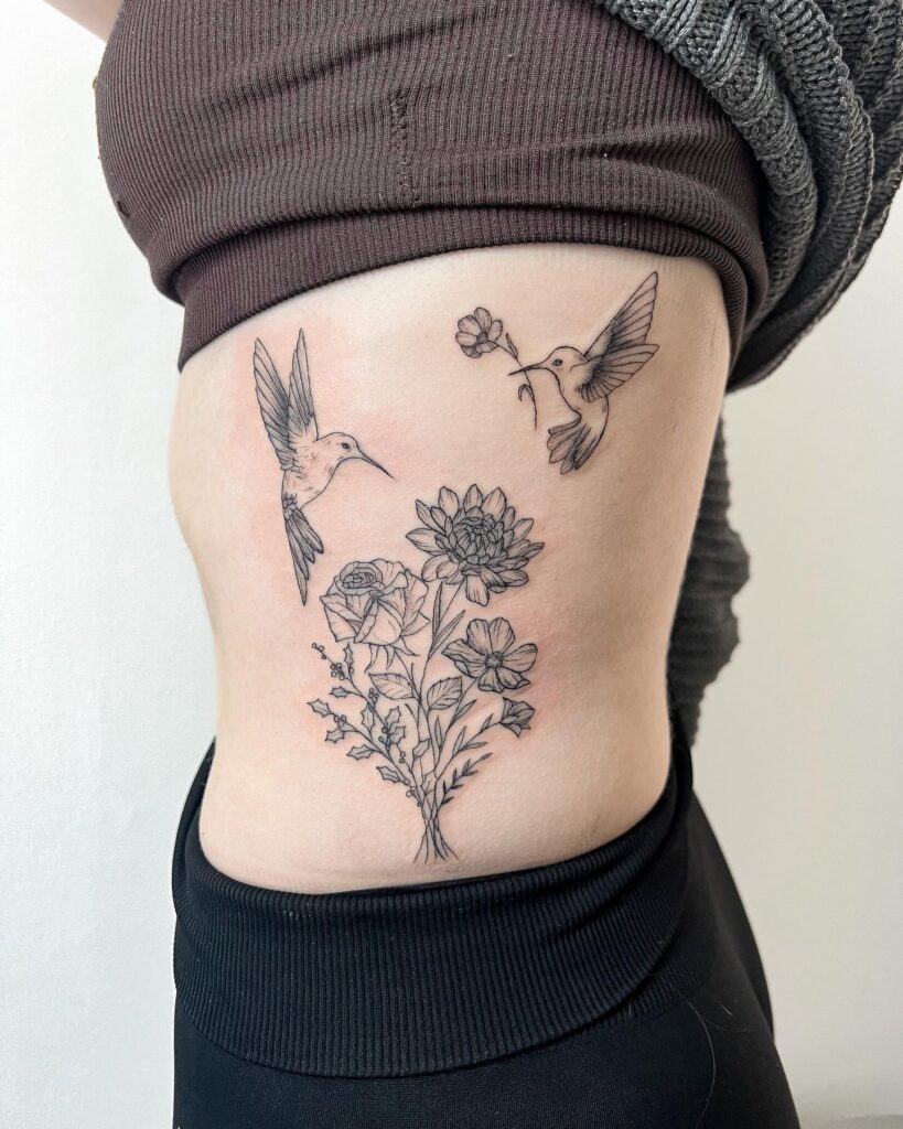 This delicate rib tattoo features two finely detailed hummingbirds hovering gracefully around a blooming floral arrangement. The precise black linework captures the lightness of the birds’ wings while maintaining a soft, airy feel. The flowers below add balance and structure, creating a harmonious nature-inspired composition.