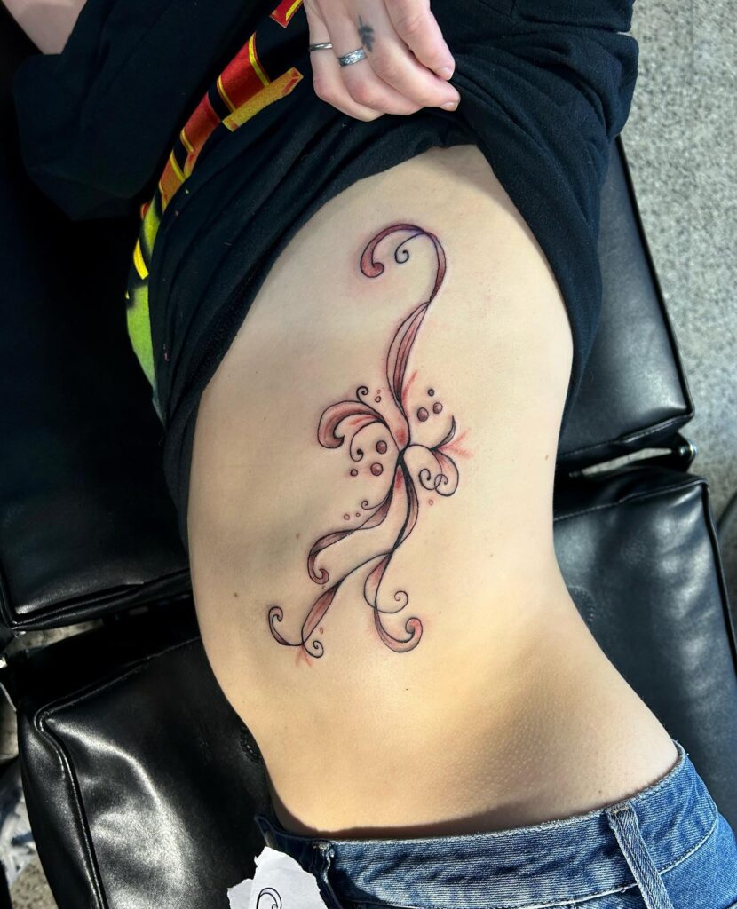 Perfect for lovers of artistic and feminine tattoos, this design focuses more on form and movement than literal imagery. The rib placement enhances its elegance, making it feel like a natural extension of the body. It’s ideal for those wanting a unique, expressive tattoo with a delicate touch.