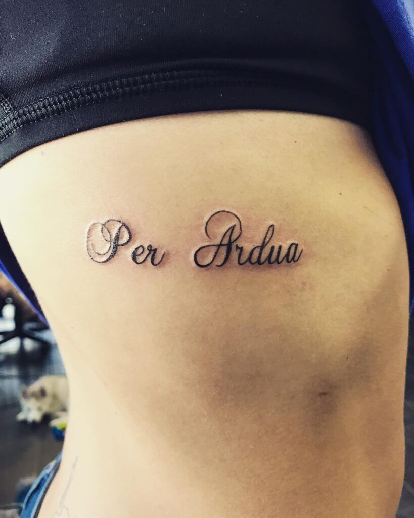 This minimalist script tattoo features the Latin phrase “Per Ardua,” meaning “through adversity,” delicately inked along the ribcage. The flowing cursive font adds sophistication and softness, while the simplicity of black ink keeps the message clear and powerful. Its subtle placement makes it feel deeply personal and intimate.