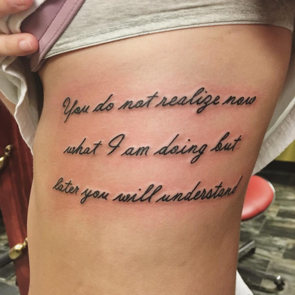 This rib tattoo displays an inspirational quote written in flowing cursive: “You do not realize now what I am doing but later you will understand.” The handwritten-style font adds warmth and emotional depth, making the message feel personal and reflective. The black ink keeps the focus on the words themselves.