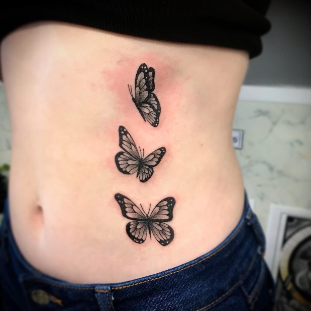 This rib tattoo showcases three delicately inked butterflies ascending vertically, symbolizing transformation, freedom, and personal growth. Rendered in soft black and grey tones, the fine detailing on the wings adds depth without overpowering the skin. The spacing between each butterfly creates a sense of motion, as if they’re gently floating upward along the ribs.