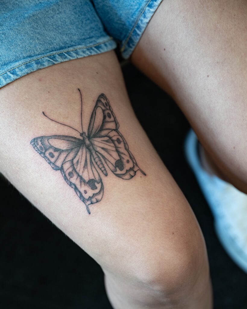 This tattoo presents a more detailed butterfly design placed on the thigh, with intricate wing patterns and soft shading. The larger size allows for realism, showcasing texture and depth while maintaining a balanced, natural look. The thigh placement provides ample space for detail and smooth lines.