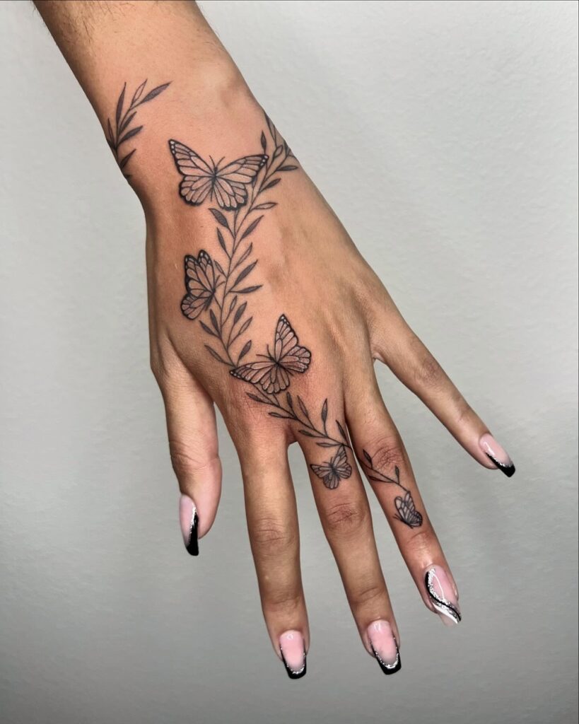 This hand tattoo blends fine-line butterflies with delicate botanical elements, creating a flowing, nature-inspired composition. The leaves guide the eye across the hand, while the butterflies add softness and movement. The balance between flora and fauna gives the design a harmonious feel.