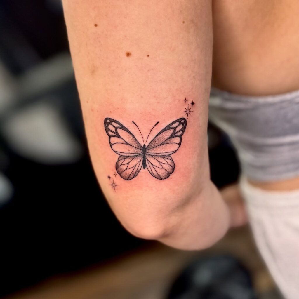 This inner arm tattoo features a softly shaded butterfly with fine detailing along the wings. The gentle gradients give it a realistic yet delicate appearance, while the small spark-like accents add a whimsical touch. The placement enhances its intimate and personal feel.