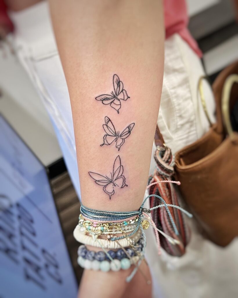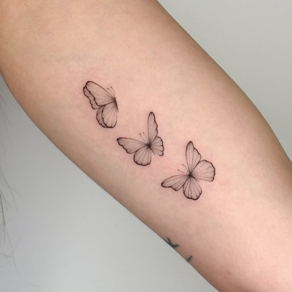This design features three finely outlined butterflies placed in a gentle sequence on the arm. The wings are lightly shaded, giving the tattoo a soft, almost floating appearance. The simplicity of the composition enhances its elegance and makes it easy to wear every day.