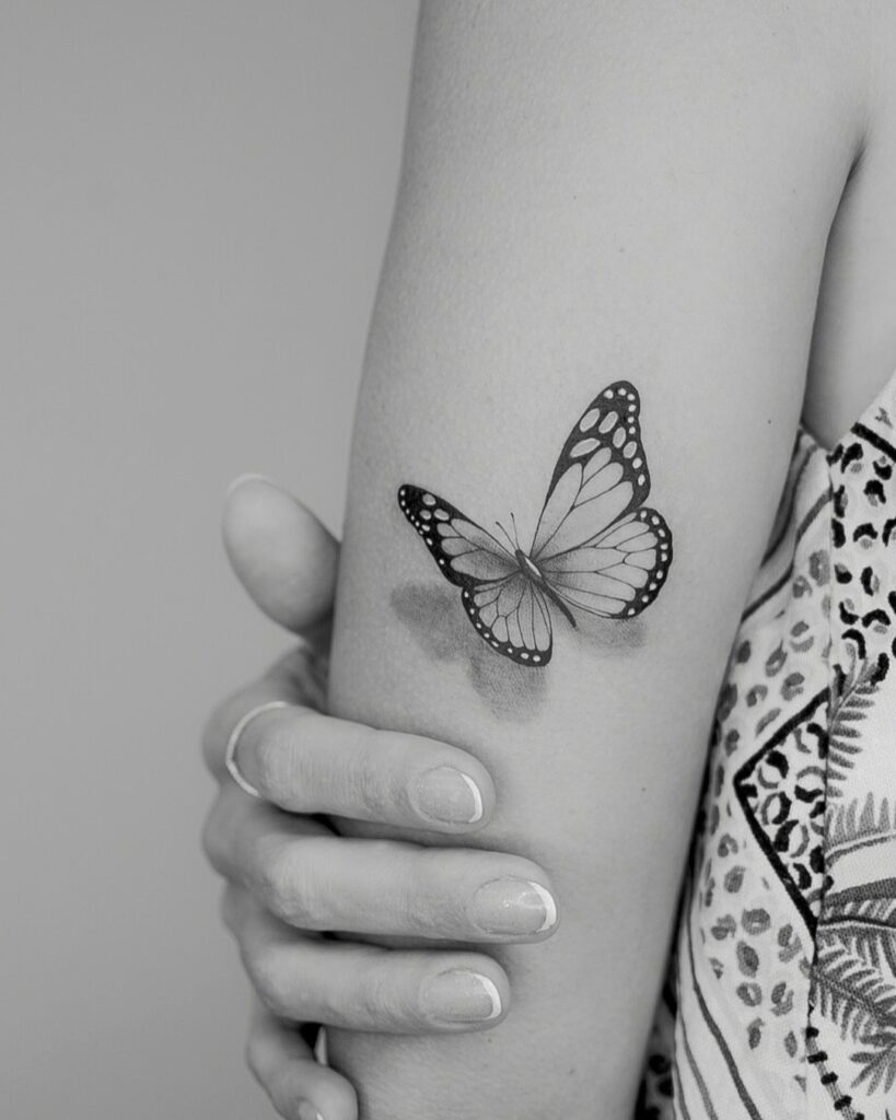 8. Soft Shaded Butterfly Inner Arm Tattoo