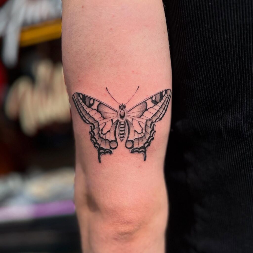 This tattoo features a bold, symmetrical butterfly centered near the elbow. The wings are richly detailed with strong outlines and shading, creating a powerful visual impact. The symmetry enhances balance, while the placement makes the tattoo dynamic as the arm moves.