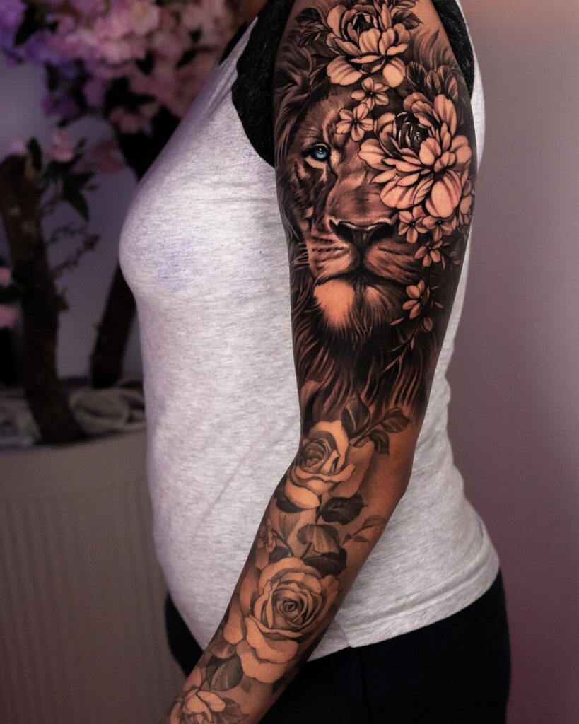 This powerful sleeve tattoo combines realistic roses with a lion portrait, blending floral beauty and animal strength. The detailed shading creates depth and realism throughout the composition.