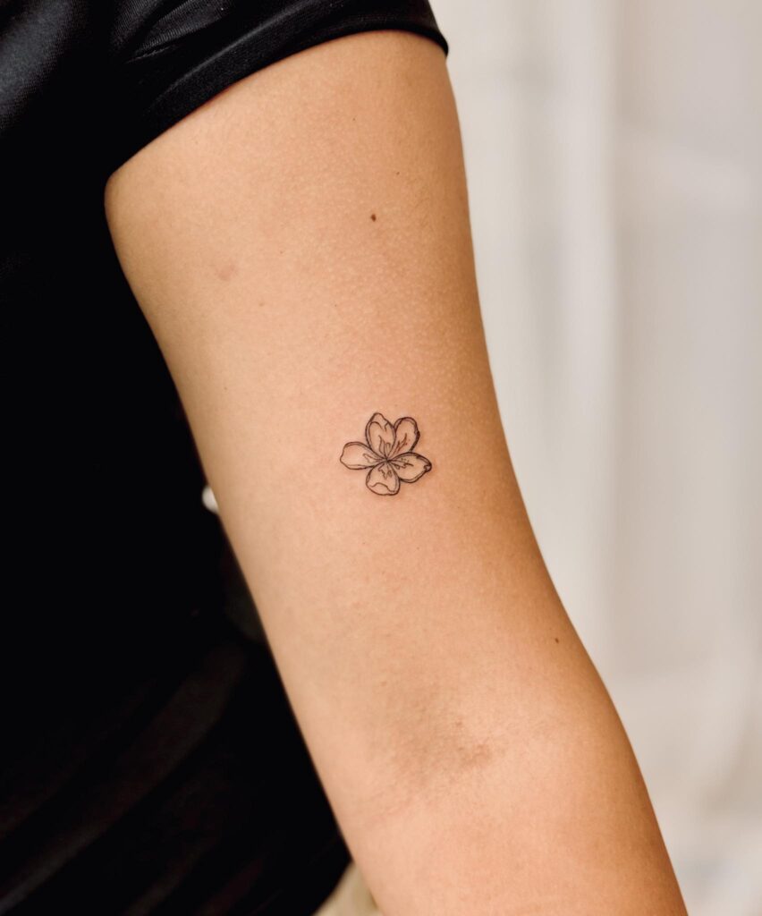 This small floral tattoo features a single blossom drawn with clean, fine lines. Its simplicity allows the flower’s shape to stand out without heavy shading or color.