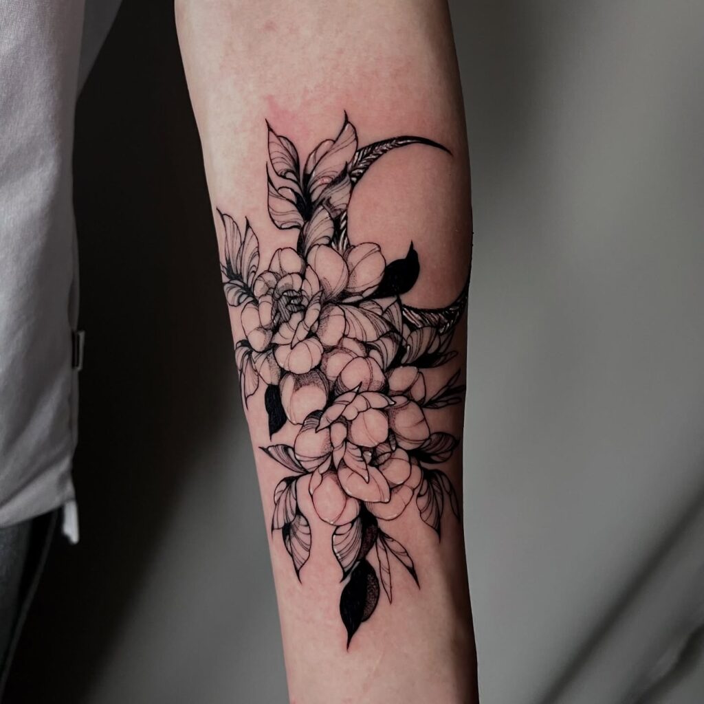 This intricate forearm tattoo merges blooming flowers with a crescent moon, creating a balanced blend of nature and celestial symbolism. The fine shading adds depth while keeping the design light.