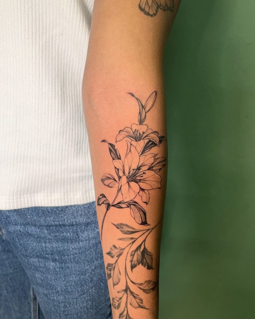 This elegant forearm tattoo features a blooming lily rendered in delicate fine-line work, with soft shading that adds depth without overpowering the skin. The flowing stem and leaves follow the natural curve of the arm, creating a graceful, elongated composition.