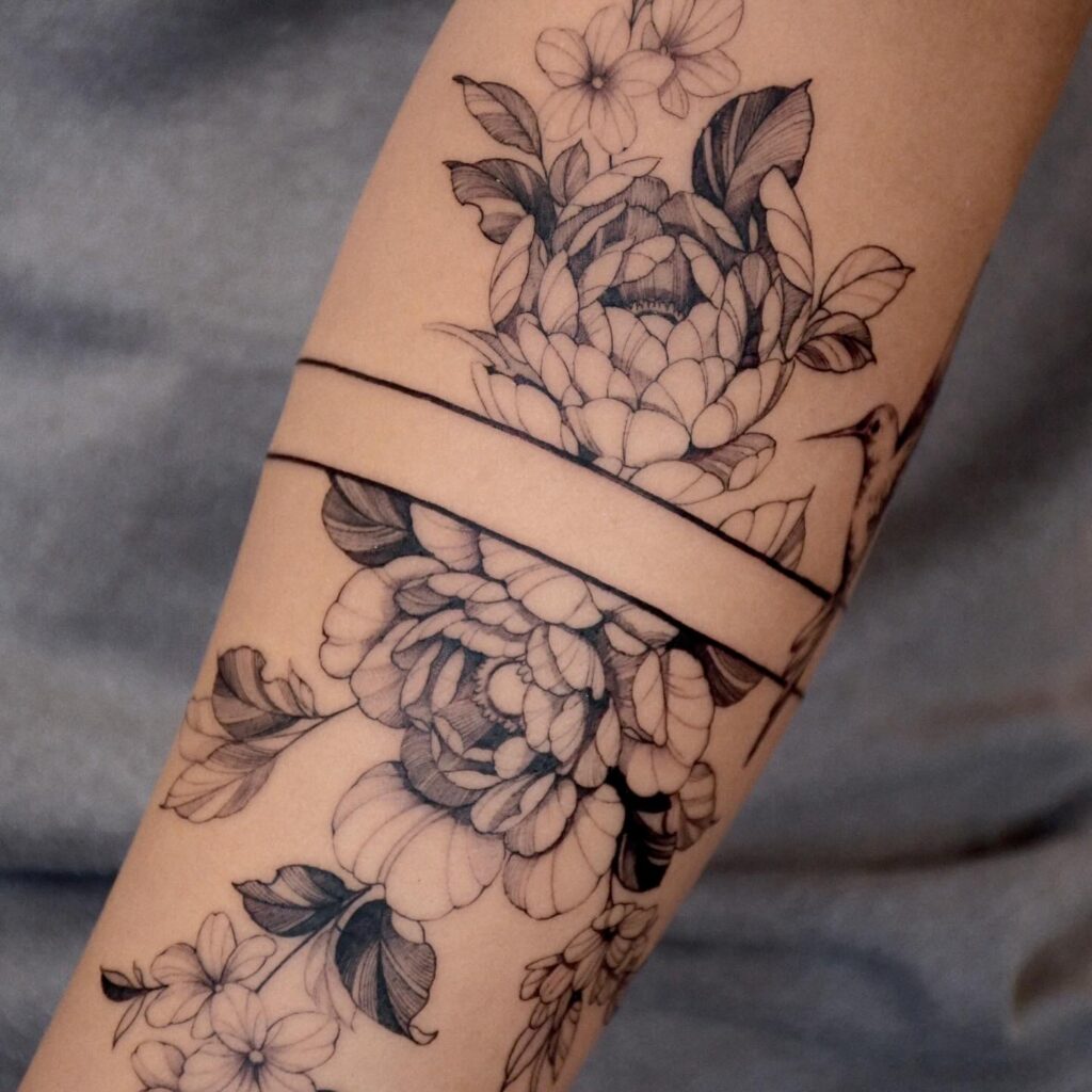 2. Peony Band Floral Arm Tattoo